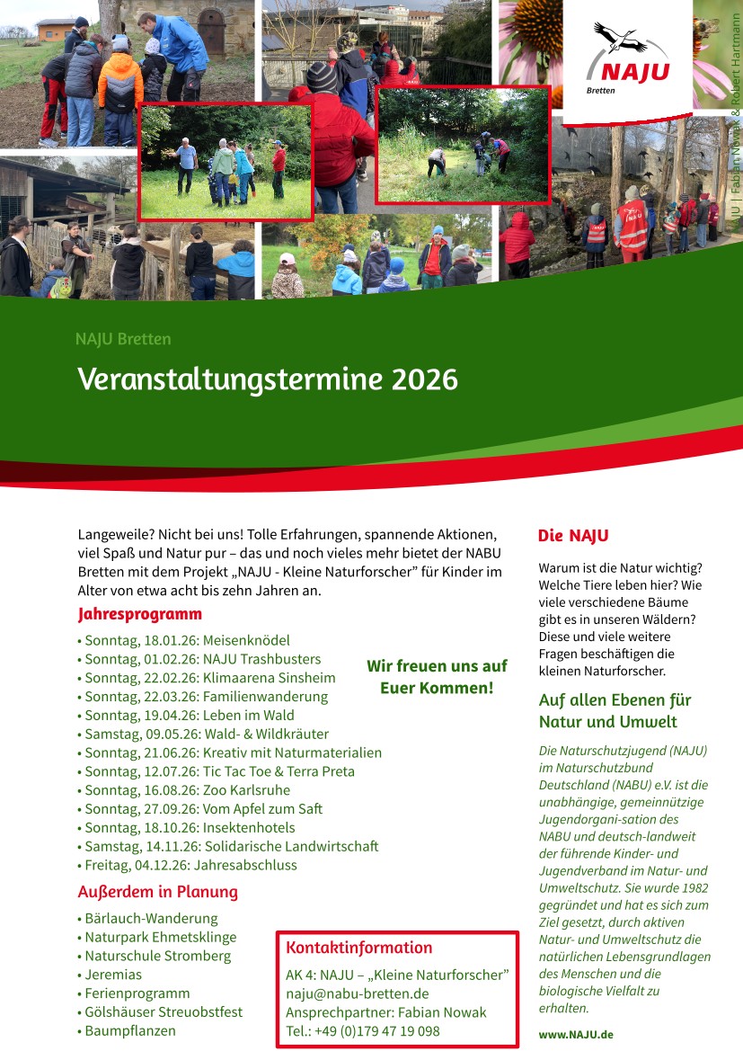 Am 9. Mai 2026 wollen wir uns mit Wald- und Wildkräutern beschäftigen: Welche kann man essen, was kann man daraus machen. Treffpunkt ist um 10 Uhr am Wanderparkplatz an der Grillhütte Rinklingen. Programmdetails folgen. Anmeldung bitte bis Donnerstag, 7. Mai 2026 an naju@nabu-bretten.de.