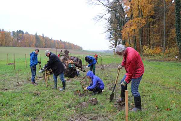 Die zwölfköpfige Pflanzmannschaft hat bei leichtem Nieselregen und einem – ach wie gern erinnert man sich dabei an die eigenen Kindertage zurück – hör- und spürbar matschigem Untergrund, in der Zeit sogar den vorerst notwendigen Wildschutzzaun rund um die Sträucher aufgestellt. Ein kleiner Einsatz mit großer Wirkung: ein neuer Naturschwerpunkt ist entstanden und wird in den kommenden Jahren an „wachsender“ Bedeutung gewinnen. „Dachs, Igel und Grünspecht sind einige der dauerhaften Besucher solch artenreicher Treffpunkte“, sagt Fritz.