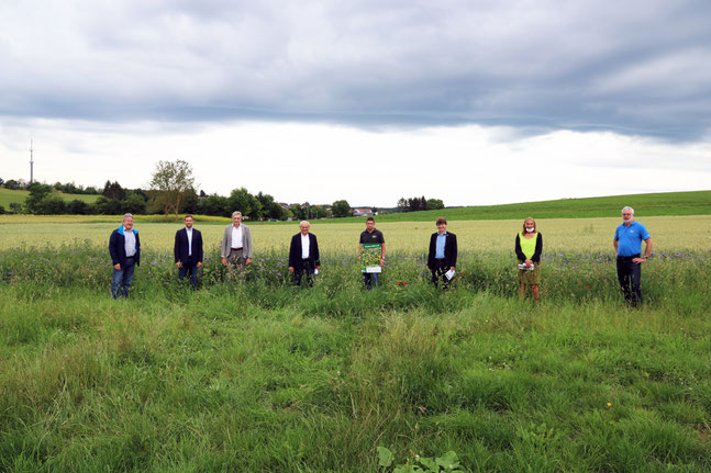 Das gemeinsam mit den Brettener Landwirten ausgearbeitete und im Frühjahr 2019 beschlossene Förderprogramm ist 2020 mit 45 Hektar Fläche voll ausgeschöpft. Ziel der Stadtverwaltung ist es, Blühstreifen auf Ackerflächen langfristig zu fördern, um Insekten – insbesondere Wild- und Honigbienen – eine Nahrungsgrundlage zu bieten. Diesen und anderen Tieren wie Kleinwild fehlen in der intensiv genutzten Agrarlandschaft Nahrungs-, Deckungs- und Rückzugsmöglichkeiten. Das in Kooperation mit den Brettener Landwirten und dem NABU Bretten entwickelte städtische Förderprogramm „Komblü“ soll den Lebensraum Feldflur aufwerten und dem Artenschwund entgegenwirken. Dafür erhalten die Landwirte jeweils 900 Euro pro Hektar als Förderung. Bereits 2019 beteiligten sich 14 Landwirte mit rund 13 Hektar Fläche am Förderprogramm. 2020 haben sich in fast allen Stadtteilen 18 Landwirte mit 45,5Hektar angemeldet. Die Fläche hat sich so mit im zweiten Programmjahr mehr als verdoppelt. Das Förderprogramm is tlangfristig angelegt und strebt eine dauerhafte Kooperation mit den beteiligten Brettener Landwirten an. Dies wurde auch bei der Feldbegehung am vergangenen Freitag mit Bürgermeister Michael Nöltner, Stadtbaudirektor Karl Velte und Matthias Pittinger, Leiter der Allgemeinen Bauverwaltung, zusammen mit Joachim Kößler MdL und Andrea Schwarz MdL sowie Norbert Fleischer und Bernd Diernberger als Vertreter vom NABU Bretten deutlich. Treffpunkt war der Spitalhof der Familie Kern in Diedelsheim. Nach einer Einführung durch Michael Nöltner beleuchtete Norbert Fleischer das Förderprogramm aus Sicht des NABU und im Anschluss präsentierte Alexander Kern, stellvertretender Vorsitzender des Kreisbauernverbands, seine Blühstreifen und beantwortete die interessierten Fragen der Mitglieder des Landtags.