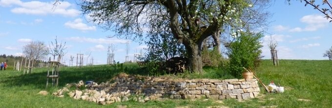 Auf der über zwei Hektar großen Wiese pflegt der Arbeitskreis Streuobst über 200 Obstbäume. Hier werden von 50 lokalen und alten Sorten je 2 Bäume erhalten. Die Stammhöhe liegt bei 1,80 m, denn sonst bleibt der Grünspecht fern, der Nach- mieter wie Fledermäuse, Hornissen, Steinkauz,  Gar- tenrotschwanz und Halsbandschnäpper anzieht.