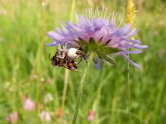 Ein Bild, das von Artenvielfalt, Liebe und Tod auf der Wiese erzählt! Doch der Reihe nach: Zu den typischen Blütenpflanzen artenreicher Wiesen zählt die blauviolett blühende Wiesen-Witwenblume (Knautia arvensis). Aber im Blütenkopf lauert gleich zweimal der Tod, denn hier hat sich eine Veränderliche Krabbenspinne (Misumena vatia) einquartiert. Oft verbringt eine Spinne fast ihr ganzes Leben auf einer einzigen Pflanze. Mit ihren kurzen Hinterbeinen hängt die Spinne an der Blütenunterseite und lauert auf Insektenbesuch, den sie mit ihren beiden langen Vorderbeinpaaren fängt, festhält, mit Gift tötet und aussaugt. Bienen, Hummeln, Schwebfliegen, Schmetterlinge und selbst Hornissen gehören zur Beute, die sie geschickt packt, um nicht selbst gestochen zu werden. In diesem Fall hat es eine Biene beim Blütenbesuch erwischt. Die Krabbenspinne ist nach ihrer äußeren Ähnlichkeit mit dem Krustentier benannt. Der Zusatz „veränderlich“ bezieht sich auf die Fähigkeit, die Körperfarbe in gewissen Grenzen zwischen weiß, gelb und grün zu variieren. Neben der Tarnung setzt die Krabbenspinne zusätzlich ultraviolette Signale auf ihrem Körper ein, die gezielt Insekten anlocken. Von Spinnen besetzte Blüten werden nachweislich häufiger von Insekten angeflogen als spinnenfreie.