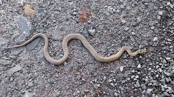 Nicht alltäglich ist die Begegnung mit einer Schlingnatter. Die zierliche, graubraune Schlange lebt verborgen und bleibt trotz ihrer weiten Verbreitung meistens die „elegante Unbekannte“. Mit 70 Zentimetern ist die auch als Glattnatter bekannte Schlange eher kurz. Sie wird wegen ihrer dunklen Rückenflecken oft für eine Kreuzotter gehalten, ist jedoch ungiftig und völlig harmlos. Zur sicheren Unterscheidung schaut man ihr in die Augen: Schlingnattern haben runde, Kreuzottern senkrecht geschlitzte Pupillen. Schlingnattern ernähren sich von Eidechsen, Blindschleichen und Mäusen, die sie mit den Zähnen packen, mit ihrem Körper umschlingen und ersticken und mit weit geöffnetem Maul verschlingen.