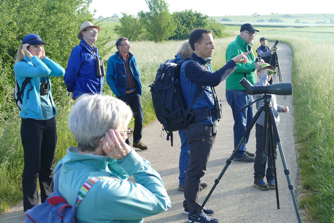 Nach zweijähriger Unterbrechung bot Eberhard Körner vom NABU Bretten am 22. Mai 2022 wieder eine Vogelexkursion an. Bei schönstem Frühlingswetter brach um 7:00 Uhr eine sehr interessierte Gruppe zu einer kleinen aber abwechslungsreichen Runde um und über den Bohnenberg bei Knittlingen auf. Abwechslungsreich waren dementsprechend auch die zu beobachtenden Vogelarten, was die kleine Auswahl der attraktivsten Arten wie Dorn- und Klappergrasmücke, Feldlerche, Goldammer, Neuntöter, Sumpfohrsänger, Gartenrotschwanz, Nachtigall, Mauersegler und Pirol belegt.