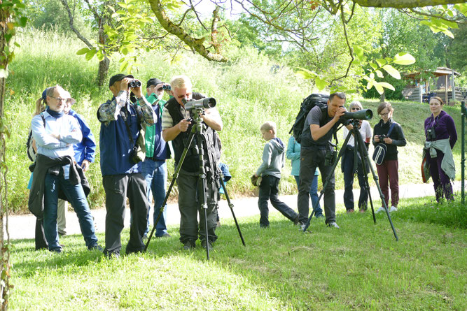 Vom Bohnenberg aus konnte dank eines stark vergrößernden Spektivs (Fernrohr) sozusagen mitten in die Kinderstube von Graureiher und Schwarzmilan geschaut werden, beide Arten brüten direkt am Weissachsee. Besonders nett waren die zwei noch flauschigen, aber auch schon recht aktiven jungen Schwarzmilane, die eifrig von ihren Eltern gefüttert wurden.
